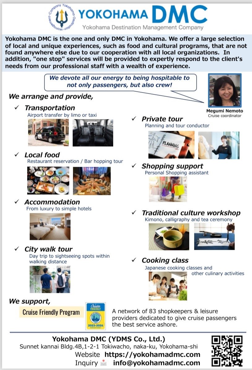 横浜DMC様とタッグを組んで、横浜港から乗下船されるお客様のサポートをしています。乗船客に細かなサービスを提供し、温かな横浜港を感じていただけることを目指しています。どうぞお気軽にリクエストください。
